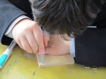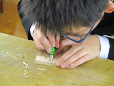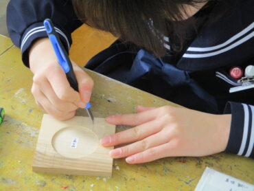 2026.1.28 NEW 1学年 1年美術 彫刻刀で彫り始めました!ー文様のあるコースターづくりー コースターのデザイン案を考えていた段階から、彫刻刀で彫る段階へと進みました。1年2組の美術の授業です。 4つの技法も学んでいるので、文様に合った彫り方を選んで彫り進めています。 失敗が許されないので、みんな集中して彫るように努めています。刃先に指を置いてはいけないなど、安全上の配慮にも気を付けています。 彫刻刀が木材を削る音以外、教室からはもの音が聞こえてはきません・・