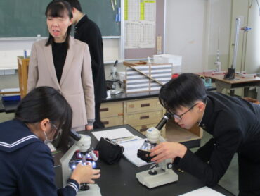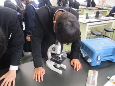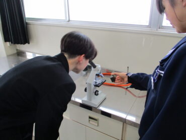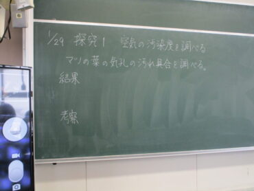 2026.1.29 3年 理科 空気の汚染度を調べよう! 今日の、3年2組の理科は、マツの葉の気孔の汚れ具合を調べて、どれだけ空気の汚れがあるのか調べる実験でした。 最初に見るのは、学校の正面玄関近くのマツの木の葉です。気孔の汚れは、ほとんどありませんでした。 理科室前面に置いてあるのは、8号線沿いから採集したマツの木の葉です。60パーセントぐらい気孔が目詰まりしていました。 今日の観察で、同じ福岡でも場所によって空気の汚れがかなり違うことを実感しました。
