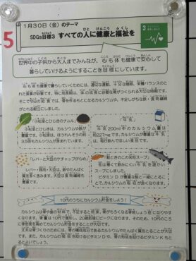 給食週間献立5日目のテーマは、SDGsの目標3「すべての人に健康と福祉を」です。