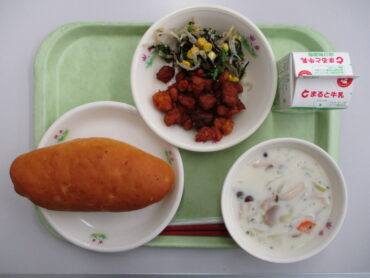 今日の給食は、体が大きくなる成長期に不足しがちなカルシウムがしっかりとれる献立になっています。骨や歯の材料になるカルシウムが不足すると、骨がスカスカになってもろくなる病気にかかりやすくなるため、今のうちから骨を大きく丈夫にしていく必要があります。