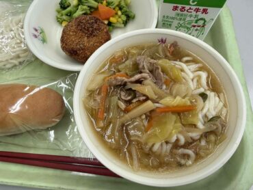 今回は高岡市ではめずらしく、ラーメン風の野菜スープにソフト麺を入れて食べました。野菜がたくさん入っていましたよ。