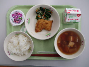 今日の給食は、郷土食献立です。献立は、ごはん、牛乳、福来魚のたれがけ、三色ひたし、いかと里芋の煮物、ぶどうゼリーです。