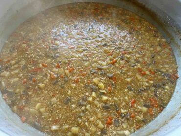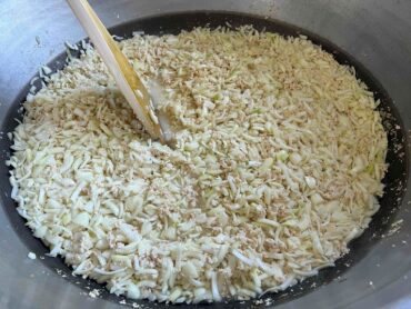 | ⑦鶏ひき肉と玉ねぎに火を通す | 金屋町の石畳煮(町並み) |