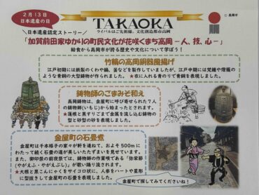 2月13日は「日本遺産の日」です。高岡市は、1609年に加賀前田家二代当主前田利長によって高岡城が築かれた後、町民のまちとして発展してきました。華やかな祭札や鋳物・漆器のものづくりの技など、町民文化が受け継がれ、現在も息づいています。この高岡の歴史ストーリーが「加賀前田家ゆかりの町民文化が花咲くまち高岡―人、技、心―」として、日本遺産に認定されています。