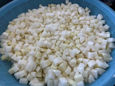 | ①大根をサイコロ状に切る(石畳) | ②黒こんにゃく(石畳) |