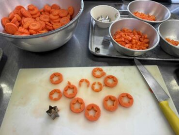 汁物は「金屋町の石畳煮」です。大根と黒こんにゃくをサイコロ状に切ることで金屋町の石畳を表しました。金屋町には千本格子「さまのこ」の町家と石畳が調和した江戸時代の風情が残る町並みがあります。道のところどころにハートや星形の銅片がちりばめられていることから、人参を一つ一つ型抜きして入れました。