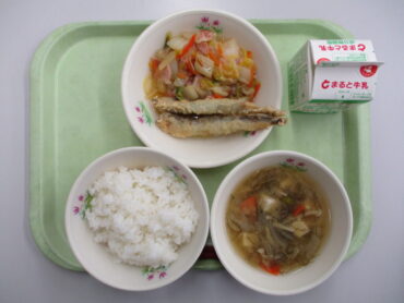 今日の給食は、ごはん 、牛乳、 ししゃものフリッター 、白菜のオイスター炒め 、もずくのみそ汁 です。
