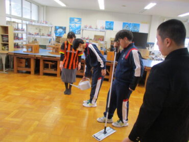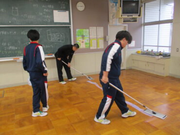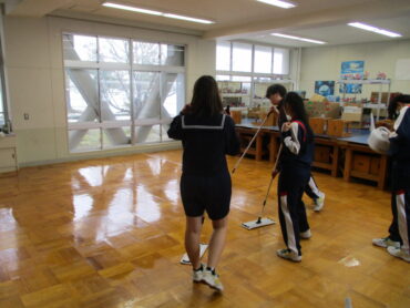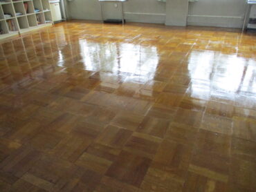 3年生の教室の床、水拭きから始まり洗剤による洗浄とワックス剥がし、そして最後の仕上げはワックス塗りです。