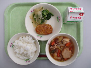2026.2.25 1学年 2学年 3学年 全校生 2月24日の給食を紹介します 今日の給食は、牛乳、ごはん、里芋ハンバーグ、かぶの色とり、すき焼き煮です。 里芋ハンバーグには、高岡市で育った美味しい里芋が使用されています。ねっとりとした食感が特徴的で福岡や戸出、中田、佐野地区で作られます。高岡市の給食だからこそ食べることのできる料理が多くてうれしいですね。 ちなみにすき焼き煮の人参も、高岡市産です。