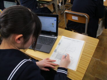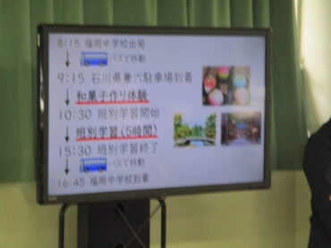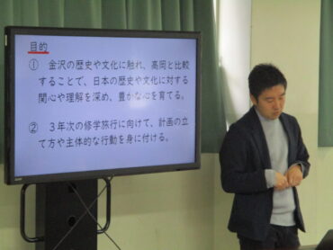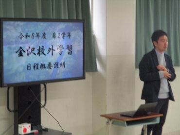 2026.3.2 NEW 1学年 1年生 終日校外学習事前学習① 1年生は、次年度の終日校外学習の事前学習を始めました。 目的地は、金沢。来年度、5月は休みが多いのと、運動会や市民スポーツ大会など行事が集中してるので、もう事前学習を始めるとのことでした。 金沢の中心部で5時間の班別行動をすると説明があり、驚きの声も。 どんな見どころがあるかの説明に、みんな真剣に聞いています。家族と行くのとはまた違った楽しみがあります。 教室に戻り、学習端末などを使って、調べ学習です。