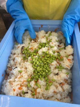 給食の「春色ちらし寿し」には、枝豆が入っています。「まめ」という言葉には「健康でまめに働くことができるように」という意味があります。また、「生きている間、食べ物に困らないように」という願いを込めて、人参や油揚げなどたくさんの食材を使った華やかなちらし寿しに仕上げました。