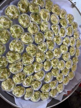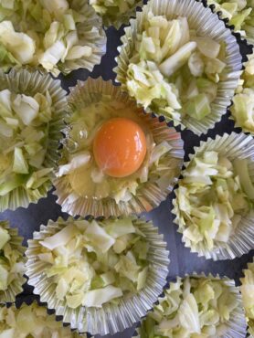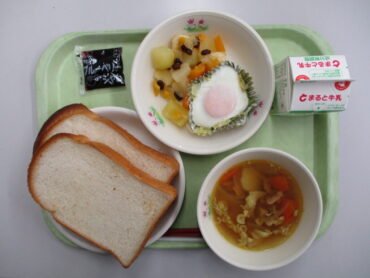 2026.3.6 1学年 2学年 3学年 全校生 3月6日の給食を紹介します 今日の給食は、牛乳、食パン、巣ごもり卵、フルーツ和え、野菜スープ、ブルーベリージャムです。 炒めたきゃべつをカップに入れて 生卵をそっと置いて 塩コショウして蒸したら完成 以前も紹介した「巣ごもり卵」! 炒めたきゃべつと卵をカップに入れて、大きい釜の中で蒸して仕上げています。今回は柔らかいカップを使用したので、いつもよりもさらに丁寧に作業して丸い形になるように気を付けてくださいました。卵がふんわり蒸されていて美味しかったです。