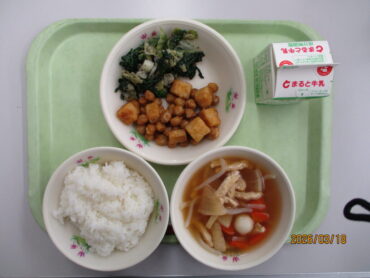 3月18日の給食は、ごはん 、牛乳、 ひよこ豆の揚げがらめ、青菜のごまみそ和え 団子汁 でした。