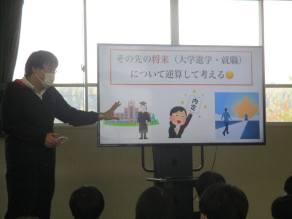 2学年2年生学年集会 進路学習 将来について逆算して考えよう!